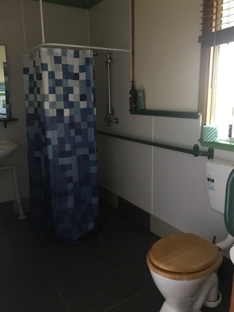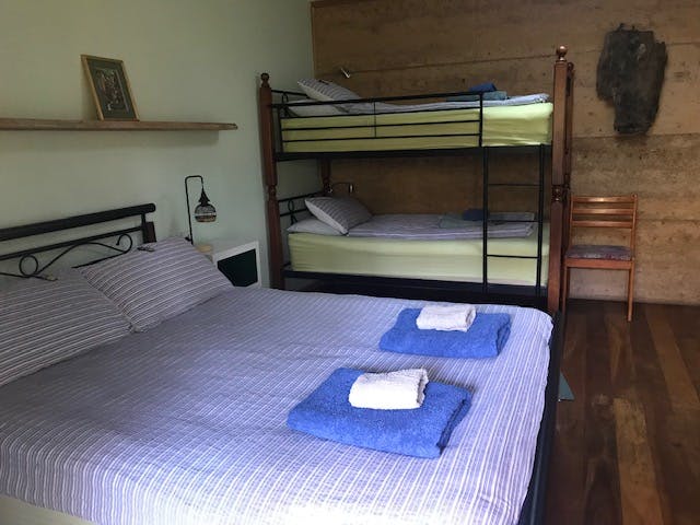 The forest room is our family room. It sleeps up to four people in a queensize bed and a bunk bed. It features air conditioning, seating, and a bathroom suitable for handicapped people.