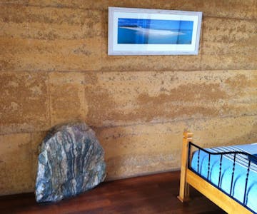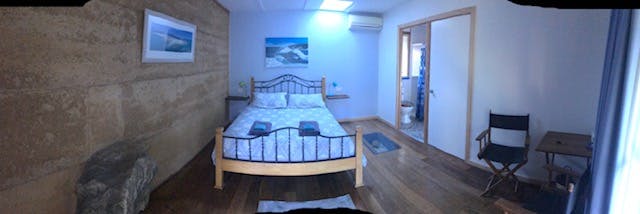 This room is a double room decorated in ocean colours and with a private mini beach feature. It has got air conditioning, seating, ensuite and entry from the verandah.